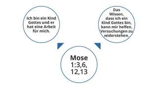 Die Schüler nennen vielleicht Wahrheiten wie diese: Ich bin ein Kind Gottes und er hat eine Arbeit für mich oder: Das Wissen, dass ich ein Kind Gottes bin, kann mir helfen, Versuchungen zu widerstehen. Zeichnen Sie von Mose 1:3,6,12,13 Pfeile zu neuen Kreisen an die Tafel. Schreiben Sie diese oder andere Wahrheiten, die die Schüler erkannt haben, in die neuen Kreise. Sie könnten die Schüler bitten, dies auch in ihr Studientagebuch zu übertragen.