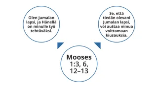Oppilaat saattoivat mainita totuuksia kuten minä olen Jumalan lapsi ja Hänellä on minulle työ tehtäväksi tai tieto siitä, että olen Jumalan lapsi, voi auttaa minua voittamaan kiusauksia. Piirrä taululle uusia ympyröitä ja nuolet niihin ympyrästä Moos. 1:3, 6, 12–13. Kirjoita uusiin ympyröihin nämä totuudet tai muita totuuksia, joita oppilaat saattoivat mainita. Voisit pyytää oppilaita tekemään saman opiskelupäiväkirjaansa.