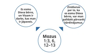 Iespējams, audzēkņi ir dalījušies tādās patiesajās mācībās, kā, piemēram, es esmu Dieva bērns un Viņam ir darbs, kas man jāpaveic, vai zināšanas par to, ka esmu Dieva bērns, var man palīdzēt pārvarēt kārdinājumu. Uzzīmējiet uz tāfeles bultas, kas iet no Mozus 1:3, 6, 12–13 uz jaunajiem apļiem. Ierakstiet šajos jaunajos apļos šīs vai citas patiesās mācības, kuras audzēkņi, iespējams, ir atraduši. Jūs varētu aicināt audzēkņus izdarīt to pašu savās studiju dienasgrāmatās.