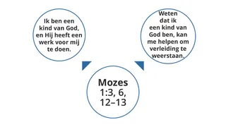 De cursisten noemen wellicht waarheden als ik ben een kind van God en Hij heeft een werk voor mij te doen, of het besef dat ik een kind van God ben, kan mij verleiding helpen weerstaan. Teken pijlen op het bord van Mozes 1:3, 6, 12–13 naar nieuwe cirkels. Noteer deze waarheden of andere waarheden die de cursisten gevonden hebben in deze nieuwe cirkels. Vraag de cursisten eventueel om dat ook in hun studiedagboek te doen.