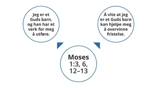 Elevene har kanskje delt sannheter som jeg er et Guds barn, og Han har et verk for meg å utføre, eller det å vite at jeg er et Guds barn, kan hjelpe meg å overvinne fristelse. Tegn piler på tavlen fra Moses 1:3, 6, 12–13 til nye sirkler. Skriv disse sannhetene, eller andre som elevene kanskje har identifisert, i disse nye sirklene. Du kan oppfordre elevene til å gjøre det samme i studiedagbøkene sine.