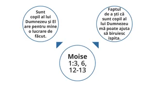 Este posibil ca membrii clasei să fi împărtășit adevăruri precum sunt un copil al lui Dumnezeu și El are o lucrare pentru mine de făcut sau faptul de a ști că sunt un copil al lui Dumnezeu mă poate ajuta să înving ispita. Pe tablă, desenați săgeți de la Moise 1:3, 6, 12-13 către alte cercuri pe care le desenați. Scrieți aceste adevăruri, sau altele pe care cursanții este posibil să le fi identificat, în aceste cercuri noi. Ei pot fi invitați să facă același lucru în jurnalele lor pentru studiu.