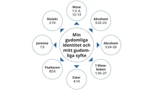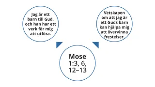 Eleverna nämner kanske sanningar som jag är ett Guds barn och han har ett verk för mig att utföra eller vetskapen om att jag är ett Guds barn kan hjälpa mig att övervinna frestelser. Rita pilar från Mose 1:3, 6, 12–13 till nya cirklar på tavlan. Skriv de här sanningarna, eller andra som eleverna kan ha hittat, i de här nya cirklarna. Eleverna kan uppmanas att göra detta i sin studiedagbok.