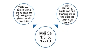Học viên có thể đã chia sẻ những lẽ thật như Tôi là con của Thượng Đế và Ngài giao cho tôi một công việc để thực hiện hoặc việc biết rằng tôi là con của Thượng Đế có thể giúp tôi vượt qua cám dỗ. Vẽ lên trên bảng các mũi tên từ Môi Se 1:3, 6, 12–13 hướng đến các vòng tròn mới. Hãy viết những lẽ thật này hoặc những lẽ thật khác mà học viên có thể đã nhận ra vào các vòng tròn mới. Học viên có thể được mời làm điều tương tự trong nhật ký học tập của mình.