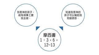 學生可能已經分享了一些真理,例如:我是神的孩子,祂有件事工要我去做,或知道我是神的孩子可以幫助我克服誘惑。在白板上畫幾個箭頭,從摩西書1:3,6,12-13指向新的圓圈。在這些新的圓圈中寫下這些真理,或學生可能找到的其他真理。可以請學生在他們的研讀日記中做同樣的事情。