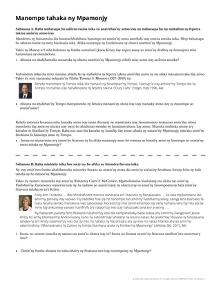 Halalino ny iray na maromaro amin’ireo ohatra ao amin’ilay taratasy zaraina izay tsapanao fa afaka manampy anao rehefa mihevitra ny hanaiky sy hanatanteraka ireo antso ao amin’ny Fiangonan’ny Mpamonjy ianao.