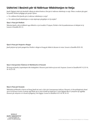 Për t’i ndihmuar nxënësit të studiojnë rrëfimin e Jozefit, mund të jepni fletushkën shoqëruese. Nëse doni, mund t’i caktoni secilit grup një pjesë të ndryshme dhe t’i vini ata të përgatiten për t’iu përgjigjur dy pyetjeve në fletushkë.