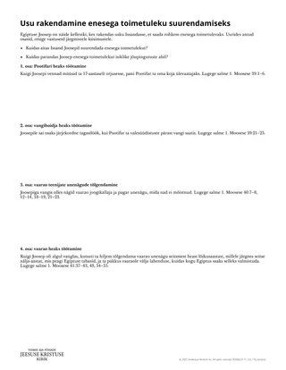 Selles õppetunnis loevad õpilased 1. Moosese raamatust lugu Joosepist Egiptuses. Enne selle loo uurimist võite näidata videot „I Will Provide for My Saints” (3:08) ajakoodist 0:00 kuni 1:52 ning paluda õpilastel otsida tõendeid nii Issanda väe kui ka Tema soovi kohta meid aidata, kui rakendame usku Temasse, et tugevdada enesega toimetulekut. See tegevus aitab õpilastel mõelda Issanda soovile aidata Joosepit ja väele teda tema rasketes oludes õnnistada.