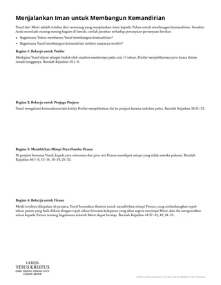 Dalam pelajaran ini, siswa akan membaca dari kisah Yusuf di Mesir dalam Kejadian. Sebelum menelaah kisah tersebut, Anda dapat menayangkan video “I Will Provide for My Saints” (3:08) dari kode waktu 0:00 hingga 1:52 dan meminta siswa mencari bukti baik kuasa maupun hasrat Tuhan untuk membantu kita sewaktu kita menjalankan iman kepada-Nya untuk membangun kemandirian. Melakukan ini dapat membantu siswa berpikir mengenai hasrat Tuhan untuk membantu dan kuasa untuk memberkati Yusuf dalam keadaannya yang sulit.