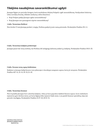 Kad mokiniams būtų lengviau studijuoti pasakojimą apie Juozapą, galite duoti pateiktą dalijamąją medžiagą. Galite kiekvienai grupei paskirti po skirtingą dalį ir paprašyti jų pasiruošti atsakyti į du klausimus dalijamojoje medžiagoje.