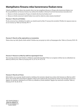 Mba hanampiana ny mpianatra handalina ny tantaran’i Josefa dia azonao atao ny manome ilay taratasy zaraina miaraka amin’izany. Azonao atao ny manome ampahany samihafa ho an’ny vondrona tsirairay ary ataovy miomana hamaly ireo fanontaniana roa ao amin’ilay taratasy zaraina izy ireo.