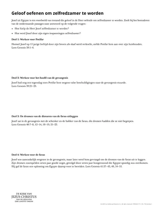 In deze les lezen de cursisten in Genesis het verhaal van Jozef in Egypte. Voordat u het verhaal bestudeert, kunt u de video ‘I Will Provide for My Saints’ (3:08) vanaf tijdcode 0:00 tot 1:52 vertonen en de cursisten laten letten op bewijs dat de Heer de macht en het verlangen heeft ons te helpen als we geloof in Hem oefenen om zelfredzaam te worden. Dit kan de cursisten aan het denken zetten over het verlangen van de Heer om Jozef te helpen en de macht om hem in zijn moeilijke omstandigheden te zegenen.