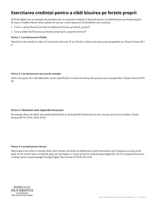 Pentru a ajuta cursanții să studieze istorisirea despre Iosif, le puteți oferi foaia de prezentare de mai jos. Puteți să desemnați fiecărui grup o parte diferită și să-i rugați să se pregătească să răspundă la cele două întrebări de pe foaia de prezentare.