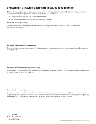 На цьому уроці студенти прочитають розповідь про Йосипа з Єгипту в книзі Буття. Перед вивченням розповіді ви можете показати відео “I Will Provide for My Saints” (Я забезпечу Своїх святих) [3:08] з часового коду 0:00 до 1:52 і запропонувати знайти докази як Господньої сили, так і бажання допомагати нам, коли ми виявляємо віру в Нього, щоб розвивати самозабезпечення. Це допоможе студентам замислитися про бажання Господа допомогти Йосипу і про Його силу благословити його в скрутних обставинах.