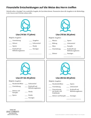 Die folgende Aufgabe soll den Schülern helfen, die inspirierten Wahrheiten, die sie herausgearbeitet haben, anzuwenden, um finanzielle Entscheidungen zu treffen. Dazu könnten Sie die Schüler in Vierergruppen aufteilen und jeder Gruppe das Arbeitsblatt „Finanzielle Entscheidungen auf die Weise des Herrn treffen“ austeilen. Weisen Sie jedem Schüler in der Gruppe eine der auf dem Arbeitsblatt angegebenen Altersgruppen zu.