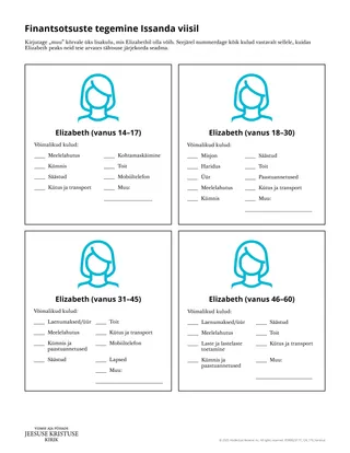 Kuvage järgmine sündmustik ja juhised. Lisaks sellele, et õpilased Elizabethi kulutusi järjestavad, võiksite anda neile ka rahalise summa, mida Elizabeth igas jaotmaterjalis toodud vanuseklassis teenib. Seejärel võiksid õpilased harjutada etteantud kuludega eelarve koostamist olemasoleva eelarve alusel.