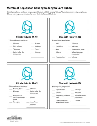 Perlihatkan skenario dan petunjuk berikut. Selain siswa memprioritaskan pengeluaran Elizabeth, Anda dapat memberikan sejumlah uang kepada siswa untuk apa yang Elizabeth hasilkan selama setiap rentang usia yang diberikan pada selebaran. Siswa kemudian dapat berlatih menganggarkan pengeluaran yang diberikan berdasarkan anggaran yang tersedia.