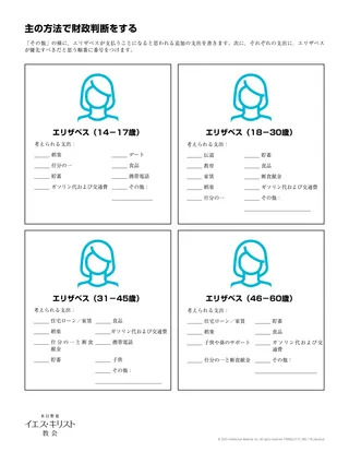 次の活動は,生徒が霊感によって見つけた真理を使って金銭的な決断を下す練習をすることを目的としています。これを行うために,生徒を4人ずつのグループに分け,各グループに「主の方法で財務に関する決定を下す」という表題の資料を配ります。グループの各生徒に,配付資料にある年齢層の一つを割り当てます。