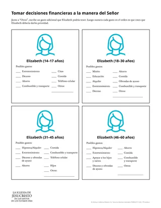 La siguiente actividad está diseñada para ayudar a los alumnos a practicar el uso de las verdades inspiradas que encontraron para tomar decisiones financieras. Para ello, podría dividirlos en grupos de cuatro y entregar a cada grupo el volante titulado “Tomar decisiones financieras a la manera del Señor”. Asigne a cada alumno de cada grupo uno de los rangos de edad que se presentan en el volante.