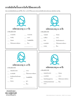 กิจกรรมต่อไปนี้ออกแบบมาเพื่อช่วยให้นักเรียนฝึกฝนการใช้ความจริงที่ได้รับการดลใจที่พวกเขาระบุเพื่อทําการตัดสินใจทางการเงิน ในการทําเช่นนี้ ท่านอาจแบ่งนักเรียนออกเป็นกลุ่มๆ ละสี่คนและแจกเอกสารชื่อ “การตัดสินใจเรื่องเงินในวิธีของพระเจ้า” ให้แต่ละกลุ่ม แจกช่วงอายุที่อยู่ในเอกสารแจกให้นักเรียนแต่ละคนในกลุ่ม