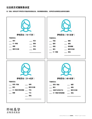 以下活动是为了帮助学生,练习运用他们所找到的受灵启发的真理来作财务决定。要做到这点,不妨将学生分成四人一组,并向每组提供「以主的方式作财务决定」为题的讲义。分别给小组中的每个学生指派讲义所展示的一个年龄范围。