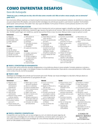 Como você se adapta aos desafios emocionais que enfrenta? Sentimentos difíceis são uma parte normal da vida. Nossa capacidade de suportar com fé esses sentimentos aumenta à medida que confiamos na força e no poder do Pai Celestial e de Jesus Cristo. Esta lição vai ajudar os alunos a obter forças do Pai Celestial e de Jesus Cristo para lidar com os desafios emocionais que eles têm.