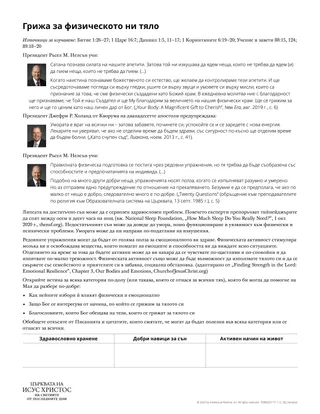 Небесният Отец ни е дал физически тела като част от Своя план да станем като Него (вж. „Семейството: прокламация към света“, ChurchofJesusChrist.org). Но начинът, по който се грижим за телата си, не засяга само нашето бъдеще, а засяга и начина, по който се чувстваме сега. Този урок може да помогне на учениците да разберат как нашите избори влияят на нашето физическо и емоционално здраве.