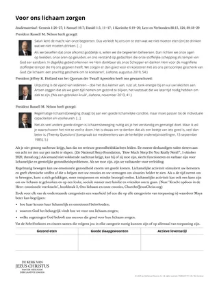 Onze hemelse Vader heeft ons een stoffelijk lichaam gegeven als onderdeel van zijn plan om zoals Hij te worden (zie ‘Het gezin: een proclamatie aan de wereld’, ChurchofJesusChrist.org). Maar hoe we voor ons lichaam zorgen, is niet alleen van invloed op onze toekomst, maar ook op hoe we ons nu voelen. In deze les leren de cursisten wat onze keuzes voor onze lichamelijke en emotionele gezondheid betekenen.