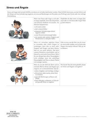 Wir alle kennen Stress und Ängste. Diese Gefühle können uns helfen, alltägliche Aufgaben zu bewältigen und die Herausforderungen des Lebens zu meistern. Anhaltender Stress und Ängste können sich jedoch negativ auf uns auswirken. Glücklicherweise hat uns der Erretter seine Hilfe und seinen Frieden verheißen (siehe Johannes 14:27). In dieser Lektion können die Schüler Fertigkeiten üben, wie man sich auf die Macht des Erretters stützt, um Stress und Ängste zu bewältigen.