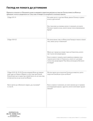 За да помогнете на учениците да открият начини, по които Господ помага на Илия и може да им помогне да се справят с чувствата на тъга и депресия, раздайте на всеки ученик материала за раздаване „Господ ни помага да устояваме“. Поканете учениците да работят самостоятелно, заедно с партньор или в група, и да следват указанията в материала за раздаване.