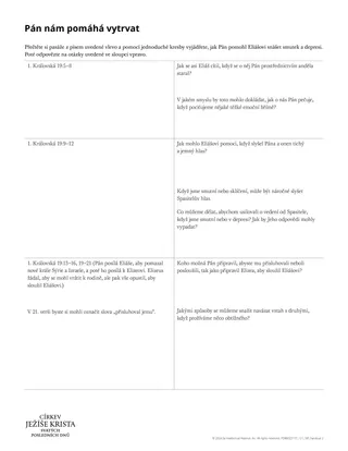 1. Královská 19:4 může vyvolat otázky týkající se sebepoškozování nebo sebevraždy. Tyto skutečnosti je zapotřebí brát vždy vážně. Připomeňte studentům, že když se někomu svěří s tím, co pociťují, jednají s vírou v Ježíše Krista. Další materiály a zdroje týkající se prevence deprese a sebevraždy lze najít v Knihovně evangelia a v doplňkových výukových činnostech v on-line verzi této příručky.