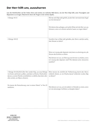Damit die Schüler erkennen, wie der Herr Elija geholfen hat und wie er ihnen helfen kann, mit Traurigkeit und Depression umzugehen, geben Sie jedem Schüler eine Kopie des Arbeitsblatts „Der Herr hilft uns, auszuharren“. Bitten Sie die Schüler, die Anweisungen auf dem Arbeitsblatt jeder für sich, zu zweit oder in einer Gruppe zu befolgen.