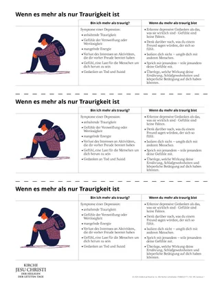 Auch die Botschaft von Präsident Jeffrey R. Holland darüber, wie man Menschen helfen kann, die mit Depressionen zu kämpfen haben, könnte hilfreich sein. Sie könnten gegebenenfalls das Video „Mental Health: Compassion for Those Who Struggle“ (2:26; in englischer Sprache) zeigen, das im Archiv Kirchenliteratur verfügbar ist. In diesem Video weist Präsident Holland darauf hin, dass kein noch so großer Eigenwille eine schwere Depression heilen kann. Professionelle Hilfe in Anspruch zu nehmen ist neben der Unterstützung und dem Mitgefühl anderer der Schlüssel zur Heilung psychischer Probleme.