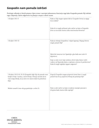 Kako biste pomogli polaznicima prepoznati načine na koje je Gospodin pomogao Iliji, te načine na koje im može pomoći upravljati osjećajima tuge i depresije, dajte svakom učeniku primjerak uručka »Gospodin nam pomaže izdržati«. Pozovite polaznike da rade pojedinačno, zajedno sa suradnikom ili u skupini i slijede upute na uručku.