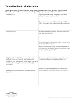 Untuk membantu siswa mengidentifikasi cara-cara Tuhan membantu Elia dan dapat membantu mereka mengatasi perasaan sedih dan depresi, berikan setiap siswa salinan selebaran “Tuhan Membantu Kita Bertahan.” Ajaklah siswa untuk bekerja secara individu, bersama seorang rekan, atau dalam kelompok, dan mengikuti petunjuk pada selebaran.