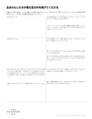 主がエリヤをどのように助けられたか,また悲しみやうつに生徒がうまく対処できるよう,主がどのように助けてくださるかを生徒が理解できるよう,資料「主はわたしたちが堪え忍ぶのを助けてくださる」を各生徒に配りましょう。配付資料の指示に従って,生徒に各自,または二人一組かグループで取り組んでもらいましょう。