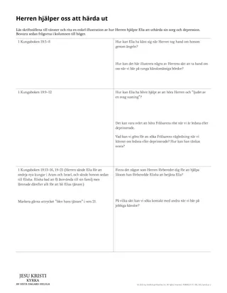 För att hjälpa eleverna urskilja Herrens sätt att hjälpa Elia och hur han kan hjälpa dem att hantera känslor av nedstämdhet och depression, ger du var och en av eleverna utdelningsbladet ”Herren hjälper oss att härda ut”. Be eleverna arbeta var för sig, tillsammans med en kamrat eller i grupper, och följa instruktionerna på utdelningsbladet.