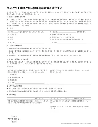 配付資料「主に近づくのに役立つ健康的な習慣の確立」は,不健康な習慣を良いパターンに置き換える人のシナリオを生徒が作るのに役立ちます。そうすれば,このスキルを自分の生活に取り入れることができます。配付資料は,クラス全体で取り組んでも,少人数のグループあるいは各自で取り組んでもかまいません。
