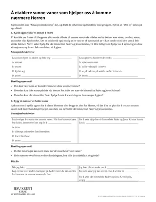 Utdelingsarket “Etablere sunne vaner som hjelper oss å komme nærmere Herren” kan hjelpe elevene å lage en situasjonsbeskrivelse der noen erstatter usunne vaner med gode mønstre. De kan så anvende denne ferdigheten i sitt eget liv. Elevene kan jobbe med utdelingsarket i fellesskap, i små grupper eller på egenhånd.