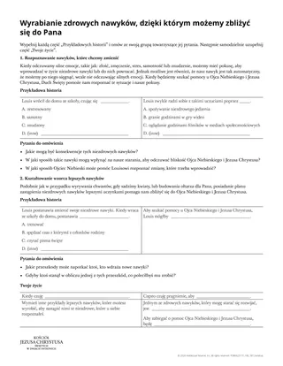 Ulotka „Ustanawianie zdrowych nawyków, które pomogą nam zbliżyć się do Pana” może pomóc uczniom w przygotowaniu scenariusza, w którym ktoś zastępuje niezdrowe nawyki dobrymi wzorcami. Następnie mogą zastosować tę umiejętność we własnym życiu. Uczniowie mogą pracować nad ulotką wspólnie, w małych grupach lub samodzielnie.