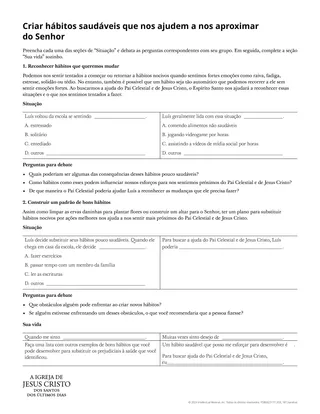 O material complementar “Estabelecer hábitos saudáveis que nos aproximam do Senhor” pode ajudar os alunos a imaginar uma situação em que alguém substitui hábitos nocivos por hábitos bons. Eles podem então aplicar essa habilidade em sua vida. Os alunos podem utilizar o material complementar como classe, em pequenos grupos ou individualmente.