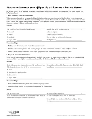 Utdelningsbladet ”Skapa sunda vanor som hjälper dig att komma närmare Herren” kan hjälpa eleverna att skapa ett scenario där någon ersätter osunda vanor med goda beteendemönster. De kan sedan tillämpa den här färdigheten i sina egna liv. Eleverna kan arbeta på utdelningsbladet som klass, i små grupper eller på egen hand.