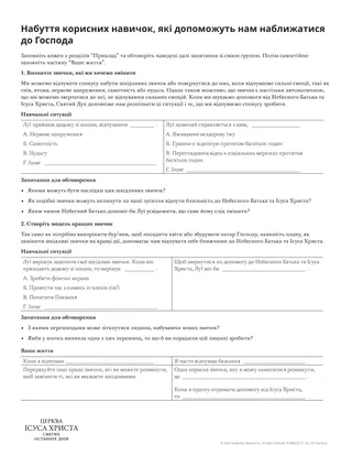 Роздатковий матеріал “Формування здорових звичок, які допомагають нам наближатися до Господа” може допомогти студентам створити навчальну ситуацію, коли хтось замінює нездорові звички на хороші. Після цього вони можуть застосувати цю навичку у своєму власному житті. Студенти можуть працювати над роздатковим матеріалом усім класом, в невеликих групах або самостійно.