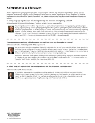 Ang Langitnong Amahan gusto nga ang Iyang mga anak nga babaye ug mga anak nga lalaki kanunayng makakat-on. Kamo adunay temporal ug espirituhanong mga rason sa pagtinguha ug mahalon ang pagkat-on. Ang edukasyon dili lang mahitungod sa pagkita og kwarta. Kini kabahin sa inyong mahangtoron nga tumong sa pagkahimong mas sama sa Langitnong Amahan. …