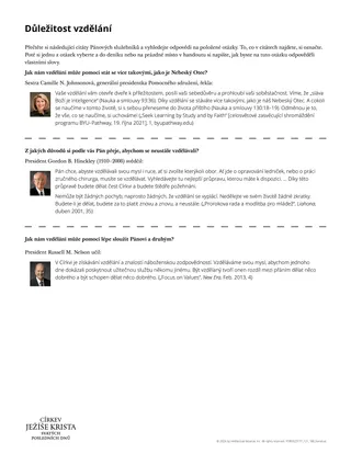 Vzdělání posiluje vaši schopnost sloužit Pánu. Uschopňuje vás k tomu, abyste žehnali druhým, zejména své rodině. Čím více se toho naučíte, tím lépe budete moci pomáhat budovat Boží království a být ve světě pozitivním vlivem. (Pro posílení mládeže: Průvodce rozhodováním [2022], 31–32)