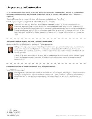 Apprends toujours. Cherche des occasions de t’ouvrir l’esprit et d’acquérir de nouvelles compétences. Cela passe notamment par l’instruction scolaire ou les formations professionnelles et par l’apprentissage informel auprès de sources dignes de confiance. Implique le Seigneur dans tes efforts, il te guidera. En découvrant le monde qui t’entoure, apprends aussi à connaître le Sauveur, qui l’a créé. Étudie sa vie et ses enseignements. Intègre le séminaire, l’institut et ton étude personnelle de l’Évangile à ton apprentissage continu tout au long de ta vie. […]