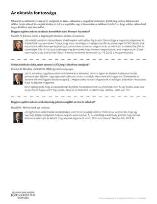 Az iskolázottság növeli az arra való képességedet, hogy az Urat szolgáld. Képessé tesz téged mások, különösen a családod megáldására. Minél többet tanulsz, annál jobban tudsz segíteni Isten királyságának az építésében, és lehetsz jó hatással a világra” (A fiatalság erősségéért: Kalauz a döntések meghozatalához [2022]. 31–32.).
