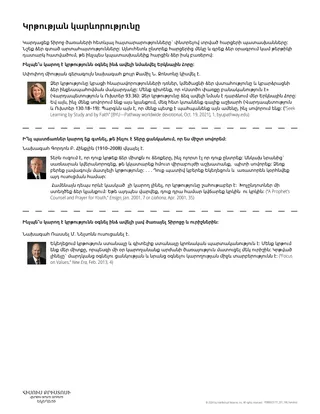 Միշտ սովորեք: Փնտրեք հնարավորություններ՝ ընդլայնելու ձեր միտքն ու ձեր հմտությունները: Այդ հնարավորությունները կարող են ներառել՝ միջնակարգ կրթություն դպրոցում կամ մասնագիտական ուսուցում, ինչպես նաև ոչ պաշտոնական ուսուցում այն աղբյուրներից, որոնց վստահում եք: Ներգրավեք Տիրոջը ձեր ջանքերում, և Նա կառաջնորդի ձեզ: Երբ սովորեք ձեզ շրջապատող աշխարհի մասին, սովորեք նաև Փրկչի մասին, որը ստեղծել է աշխարհը: Ուսումնասիրեք Նրա կյանքն ու ուսմունքները: Սեմինարիան, ինստիտուտը և ավետարանի անհատական ուսումնասիրությունը դարձրեք ձեր ողջ կյանքի ուսումնառության մասը: …