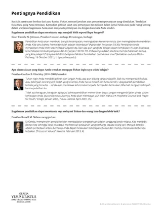 Pendidikan meningkatkan kemampuan Anda untuk melayani Tuhan. Itu memberdayakan Anda untuk memberkati orang lain, terutama keluarga Anda. Semakin banyak Anda belajar, semakin Anda dapat membantu membangun kerajaan Allah dan memengaruhi dunia demi kebaikan. (Untuk Kekuatan Remaja: Penuntun untuk Membuat Pilihan [2022], 31–32)