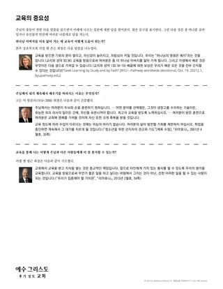 교육은 주님께 봉사하는 능력을 키워 줍니다. 그것은 여러분이 다른 사람, 특히 여러분의 가족을 축복할 힘을 줍니다. 더 많이 배우면 배울수록 더 많이 하나님의 왕국을 건설하고 세상에 선한 영향을 미칠 수 있습니다.(『청소년의 힘을 위하여: 선택을 위한 안내서』[2022], 31~32쪽)